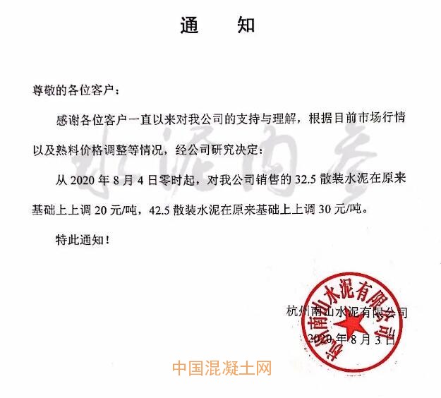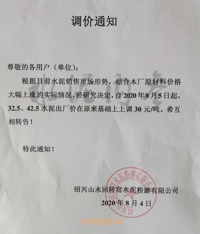 绍兴山水回转窑水泥粉磨有限欧亿在线(中国)发布调价通知,称根据目前水泥销售市场形势,结合本厂原材料价格大幅上涨的实际情况,经研究决定自2020年8月5日起,32.5、42.5 水泥出厂价在原来基础上上调30元/吨。